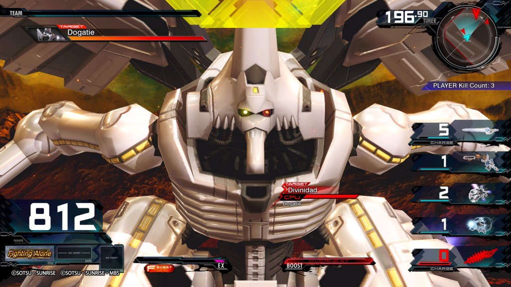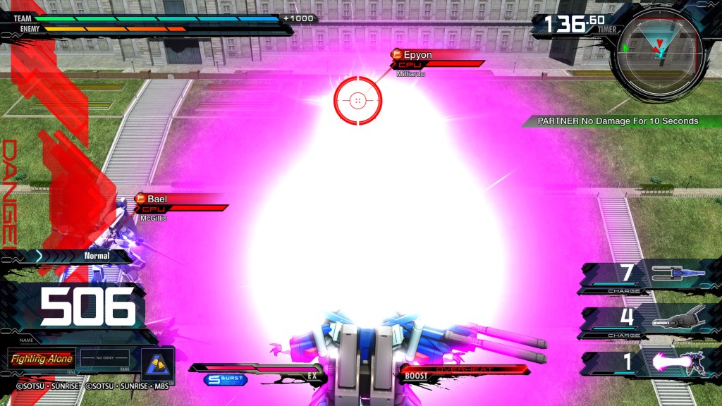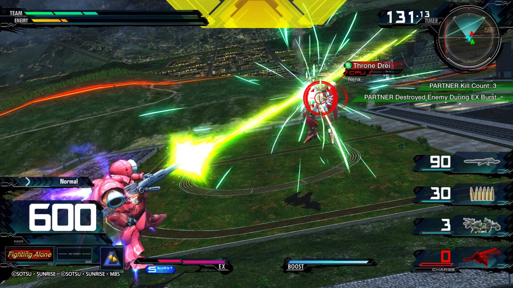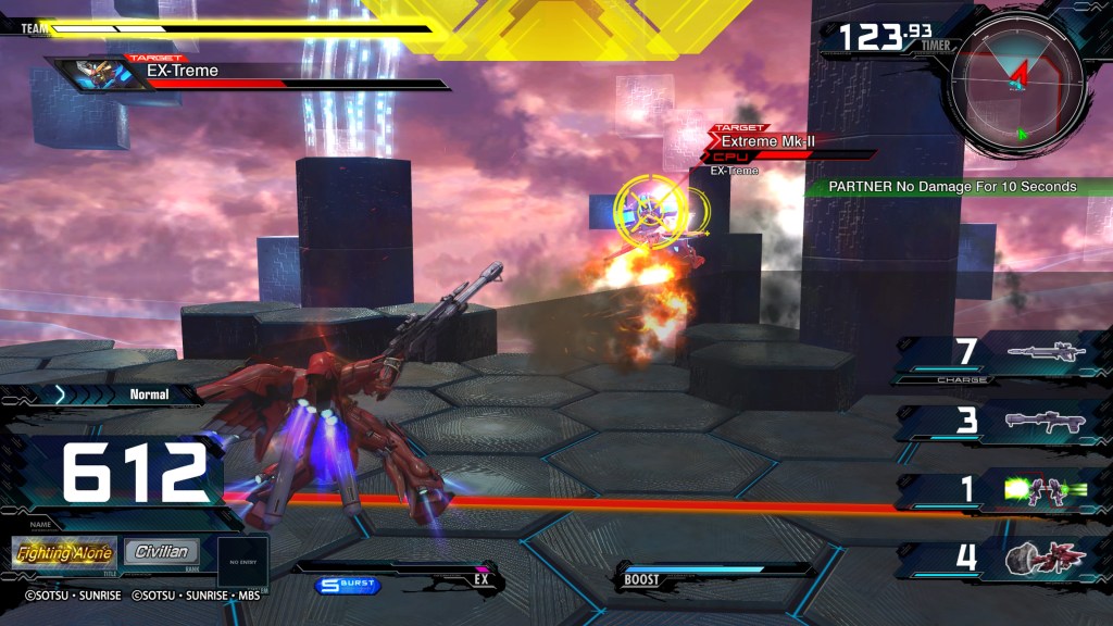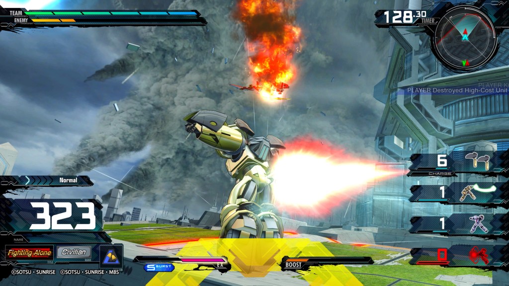 The core gameplay sounds simple: you have the ability to shoot, do a melee combo, dash and jump, with each suit having two or three special moves (large beam attacks, special melee combos, that sort of thing), and a meter at the bottom of the screen manages their access to a special “Extreme Burst” transformation that not only temporarily increases their attack power but also allows them to unleash a special one-off “Burst Attack” special move. Sounds simple, but there are little touches that make this game rather hard to get good at, mostly movement. If you stay stationary for more than a few seconds, you’re going to get hit, so you want to keep dashing or jumping to avoid in-coming fire, but you only have so much Boost power, meaning you could run out mid-air and slowly fall, unable to dodge.