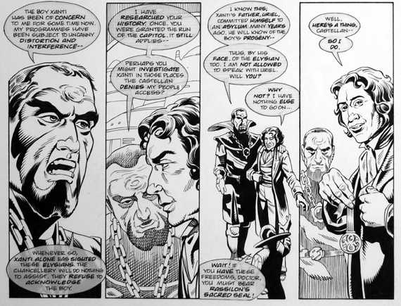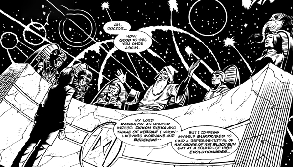 This is an epic that will be quite hard to sum up, but basically The Doctor is put into the Matrix in order to recover from the previous issue’s events and there he meets up with the “High Evolutionaries”, a group of beings from the early period of the Universe headed by none other than Rassilon himself. Before The Doctor can ask them why they hired the Threshold in the previous story (plot reveal!) he’s told of a threat to the very universe itself that involves the earliest days of the Time Lords. The Doctor then leaves The Matrix with the help of his old friend Shayde and soon is saved from an attack by assailants describing themselves as an “Elysians” by that same ally, but Izzy and a Time Lord named Xanti are captured in the process.