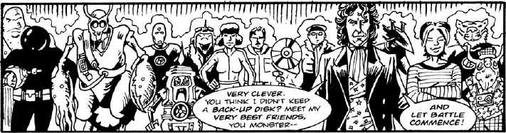 As already mentioned, the first story features extended cameos from General Ironicus from “The Iron Legion” (both a comic and audio now!), Beep the Meep from “The Star Beast” (also both a comic and audio) and Dogbolter, who first appeared in the comic “The Moderator” and has gone on to appear in various comics and audios since. In terms of the big battle at the end there are far too many cameos to list here, plus a few of them could reference a few different stories any way. Basically think of any character from Doctor Who Magazine up to this point that had even the slightest memorable role and he or she made a cameo here…