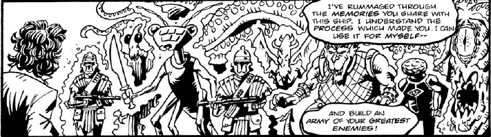 While “A Life of Matter and Death” isn’t actually bad, especially at only one issue, I can’t say it’s particularly good either. The Doctor is put on trial and judged by three of his more memorable enemies from DWM comic strip’s past: General Ironicus, Dogbolter and Beep the Meep, but a human personification of the TARDIS soon tells him that a parasite has latched onto the time machine and this is all an illusion, so soon he takes part in a mental battle with the creature. It conjures up a bunch of DWM villains, The Doctor conjures up a bunch of DWM heroes, and the two sides do battle until The Doctor wins, with himself and Izzy waking up in the TARDIS a little confused. It’s fine as a celebration of DWM’s past, but just reading it on its own in amongst other, more focused stories… it’s not really up to much.