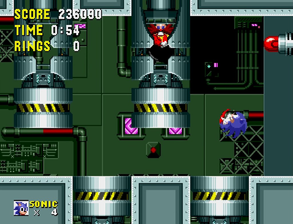 The other three trademarks of the series are the collectable gold rings, where taking a hit with rings on you means you lose the rings but continue on, take a hit with no rings and you die (also collect 100 of them and you get an extra life!), the “TVs” which when broken give Sonic a power up (bubble shield and invincibility are the only ones here, and the odd Extra Life) and finally the Special Stages, in this case a rotating maze of bumpers that slowly fade away each time they’re hit. There is a Special Stage for each Zone, reachable at the end of a stage via a portal if you’ve collected 50 rings, and if you find the centre of the maze you’ll collect a Chaos Emerald. The only way to get the actual ending is if you collect all six Emeralds, otherwise you just get an image of Robotnik taunting you!