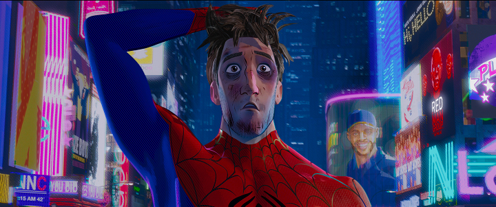 In order to shutdown the collider and hopefully get Peter back to his own universe the two eventually raid Kingpin’s lab and meet Olivia Octavius (Kathryn Hahn), a female Doc Ock, and Gwen, who is revealed to be also from another universe and a Spider-Person (which made so much more sense in my head, as Gwen in high school with Miles while Peter is already an adult as Spider-Man was hard to connect…). The three of them soon hatch a plan and meet up with the Aunt May of Miles’ universe (Lilly Tomlin) and three more alternate universe Spider-People in Peni Parker (Kimiko Mulaney), a Japanese-American girl who controls a robot that has a Spider in it she can communicate with, Spider-Man Noir (Nicholas Cage), a black and white Detective Noir version of Spider-Man, and Peter Porker (John Mulaney), a Looney Toons cartoon pig version of Spider-Man called Spider-Ham… Yep. Together they come to the conclusion that Miles isn’t ready to help them, and that one would have to stay behind and die in this universe so the others can get back. Miles is faced with more turmoil when one of Kingpin’s henchmen turns out to be his beloved Uncle… who then gets shot dead by his boss in front of him.