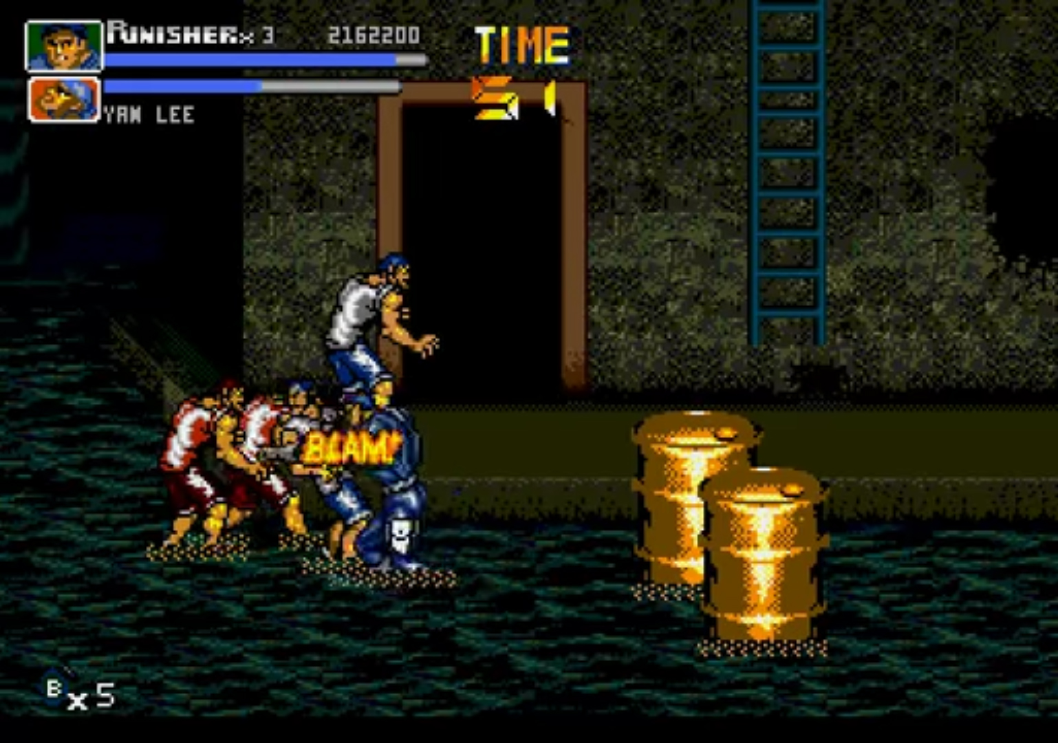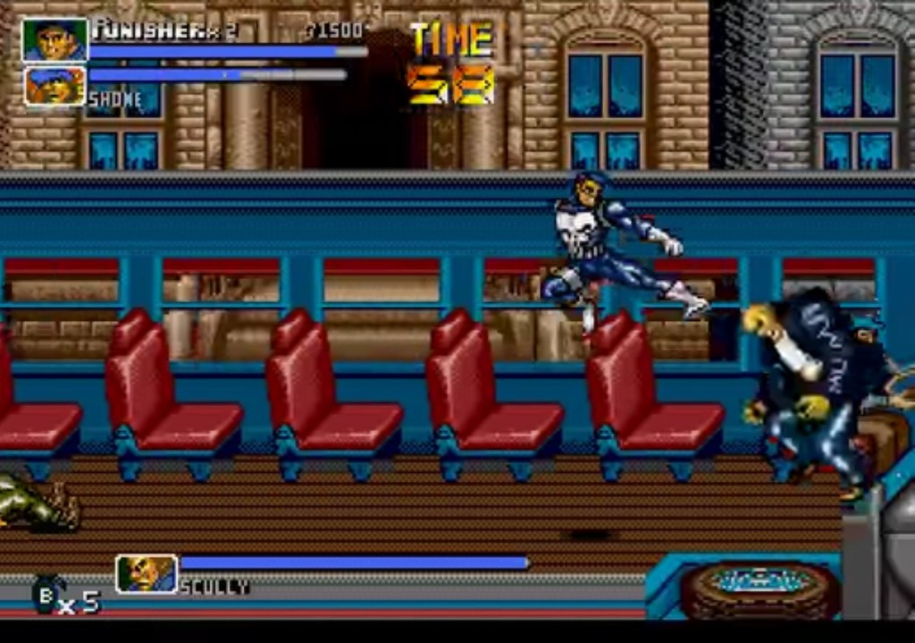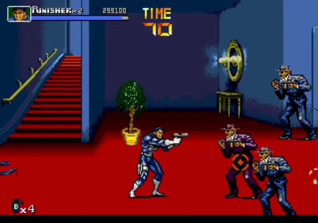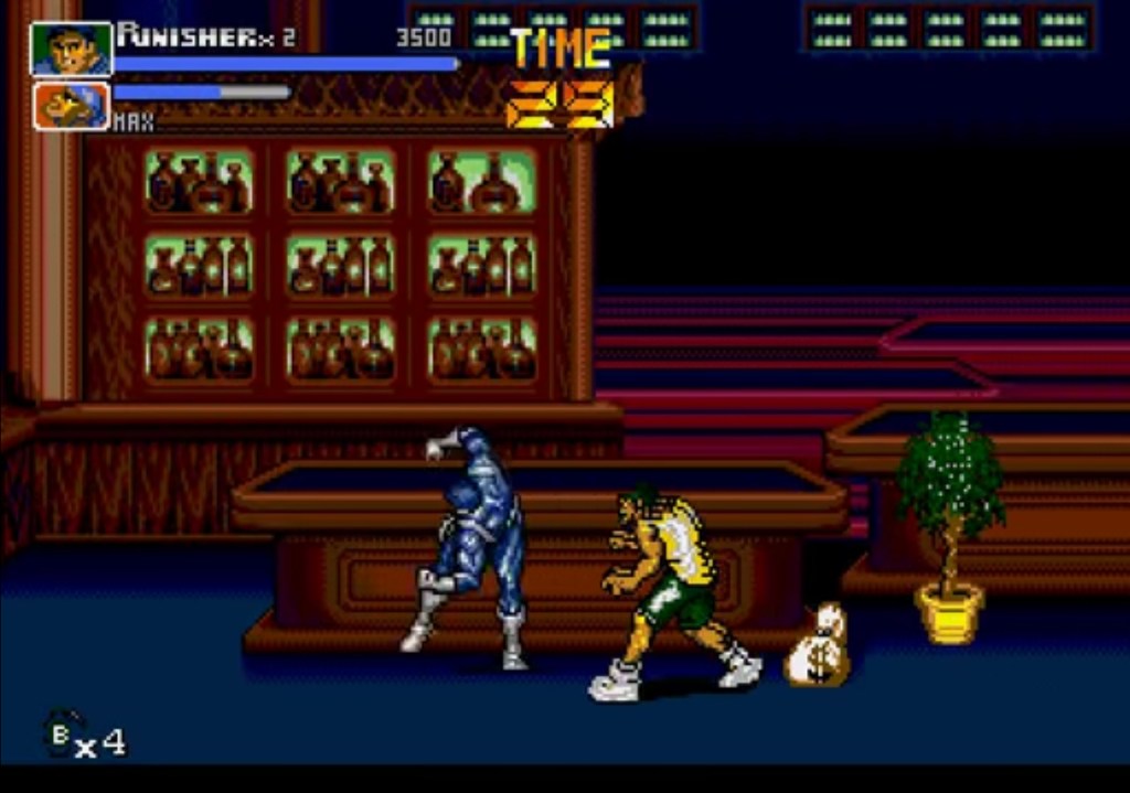 If you’ve selected 2-Player then SHIELD head Nick Fury follows Punisher around with no explanation as to why he’d just stand next to this violent vigilante and let him kill a bunch of people… or not kill them, just beat them up a bit if you’re playing the censored Mega Drive version…