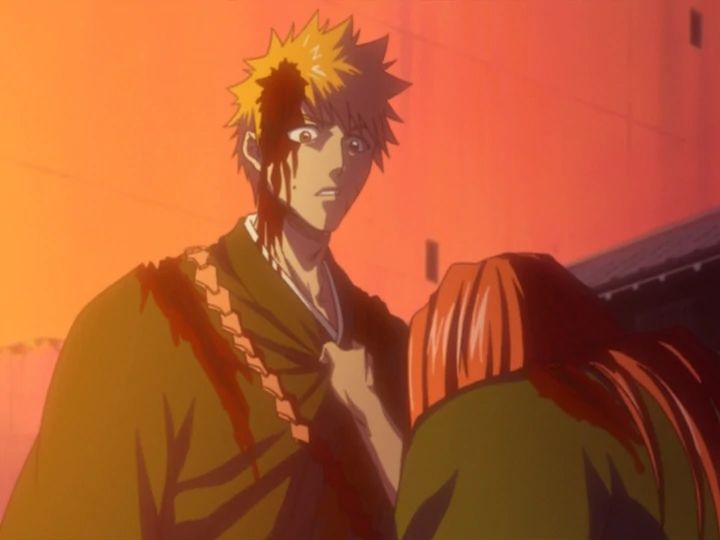 The good really depends on how much you enjoy people being horribly sliced by swords, as these 11 episodes feature Ichigo against two strong opponents in rather bloody battles. Our protagonist and Ganju arrive on the path to where Rukia is being kept thanks to Squad 4’s Hanataro knowing the way and wanting to help the kind prisoner he looked after, but they immediately encounter Renji, who squares off with Ichigo. Renji reveals that Shinigami get their power limited by a factor of five when they enter the world of the living, so he’s much stronger, something he shows by knocking Ichigo into a small concrete hut and cutting his head open. Ichigo tries his best but is on the backfoot, but before he gets a fatal blow he remembers Urahara’s words about not being afraid and finding your resolve to kill. Ichigo uses what will later be known as his trademark attack, the Getsuga Tensho, and wins the battle, though it would probably be closer to call it a draw. Renji reminisces about his and Rukia’s upbringing in the harsh slums of Soul Society, how they lost their childhood friends and enrolled in the Shinigami training school together. Remembering how he let Rukia get distant from him when she joined the Kuchiki family, he begs Ichigo to save her in his place. It’s a great performance by Renji’s voice actor, Kentaro Ito, as he pleads his enemy to do what he couldn’t, and the flashback episode actually adds some layers to the previously one-dimension character.