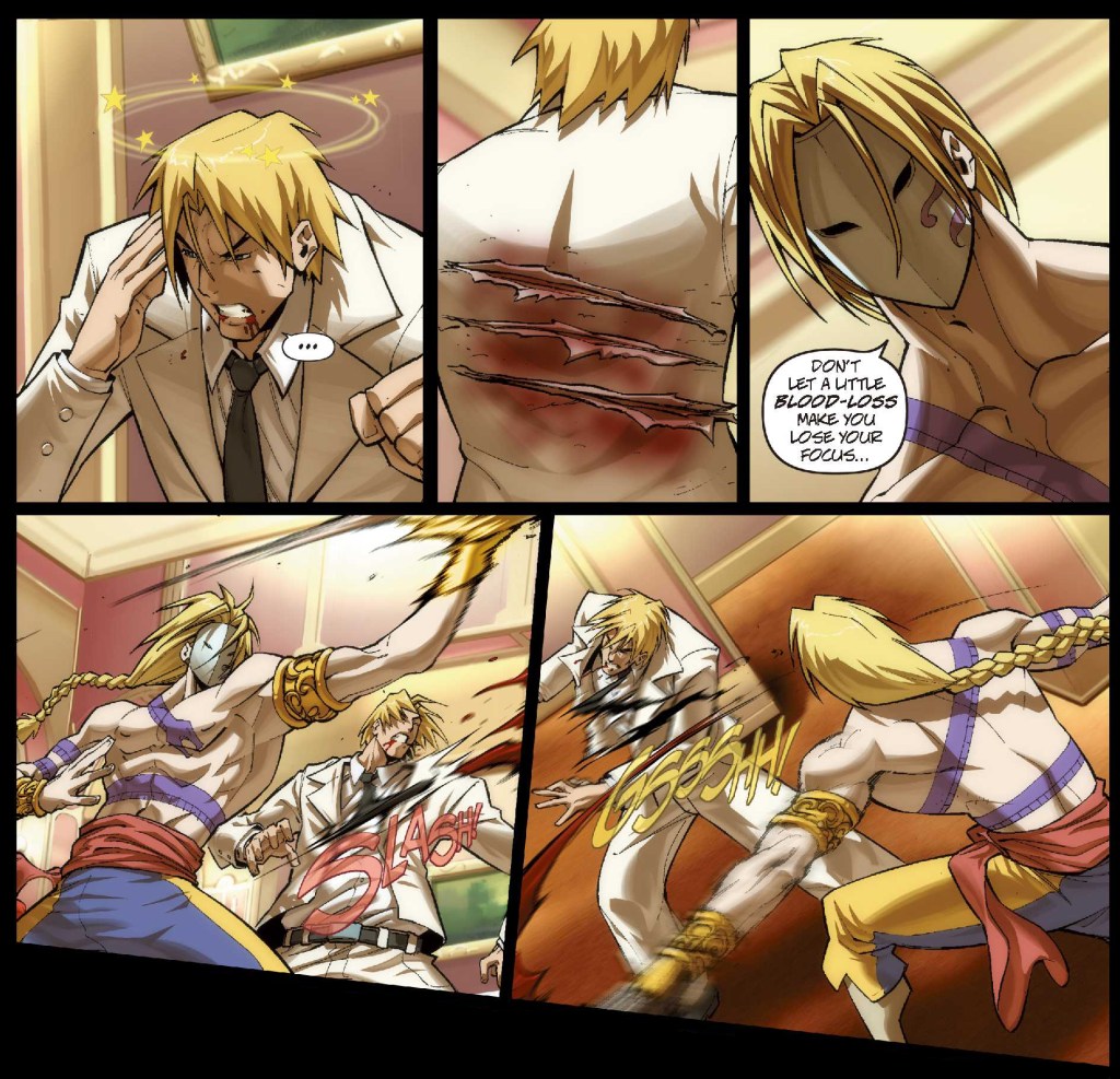 This is where everything else starts to converge as at Ken’s wedding reception are Ryu and Sakura, Guile (whose wife is Eliza’s sister) and soon Vega and Balrog, who crash the party. Ken is cut up pretty badly due to being more concerned with Eliza’s safety, and Sakura manages to master the Hadoken while Ryu battles Balrog, being impressed by his brute strength. Vega and Balrog retreat a short while later and things get set for Volume 3, including Ryu going to India to meet Dhalsim (on the advice of a not-as-angry-as-you’d-think Sagat, who we see get his trademark scar from Ryu at the end of the first tournament in a flashback), Guile has reconciled with his wife, Chun-Li has decided to carry on with Interpol after nearly quitting due to the death of her father, and Sakura goes back to school. Meanwhile Bison returns from death via some … tube thing, which I guess will explain how he returns after SFII’s storyline later on as well, which is handy!