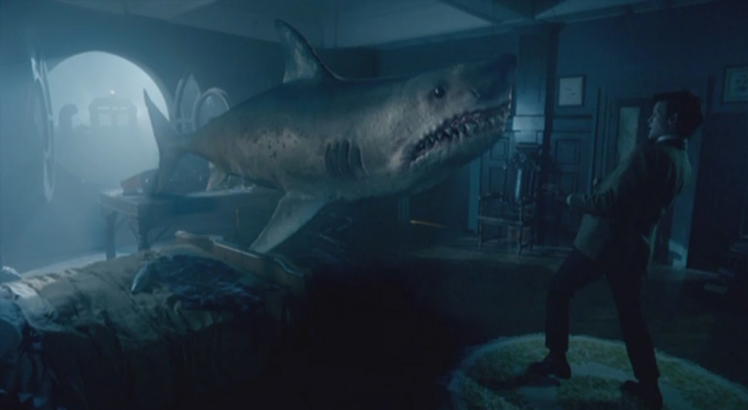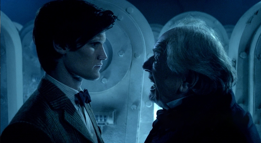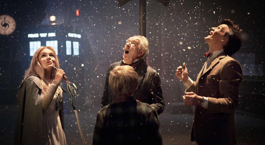 The Doctor finds out what happened and apologises, to which Sardick rightfully points out that the Time Lord had no right to rewrite his entire past, but soon The Doctor goes even further with the rules-of-time-breaking and brings Sardick’s child self to meet his current self, the shock on the child’s face looking scared at his present self sends the latter into a panic. Abigail is then released from her chamber for her last day, saying to the older Sardick that he “left it a bit late” before singing a rather beautiful song that, through some techno-babble, calms the clouds enough to let the ship land, and makes it snow to boot. Sardick breaks down and finally accepts becoming a nice person. The Doctor meets back up with Amy and Rory, and before they leave we see the older Sardick and Abigail having a great time riding a cart through the sky being pulled by a flying shark, a.k.a. a bog standard Christmas. It’s a nice, heart-warming ending to a fun story.