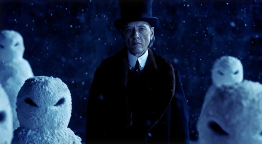 It’s time to talk about our villain of the piece: The Great Intelligence (voiced by Ian McKellen, no less!). We see it arrive on Earth fifty years ago (from when this story is set) amongst some living… space… snow(?) then communicate with a child via a snowman it created. Flashforward to the present and that child is now Dr. Simeon (Richard E. Grant) and is under the influence of the intelligence as it seeks a human body, only doable by looking at a complete scan of a human, something he finally has after a Governess died in a pond that froze over a year ago. His control over the slightly sentient alien snow and ice means he can create evil snowmen and eventually a Governess made entirely of ice, which is an interesting power (and quite a bit different from the robotic Yeti he uses in the future…)