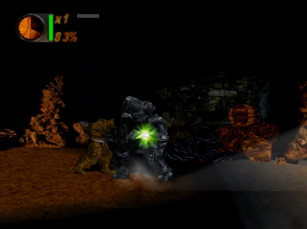 The rock-like Thing fights a black rock creature in a cave full of rocks… That’s a lot of similar textures for a single screen…