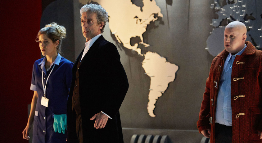This leads to a whole bunch of superman tropes, he has a love interest in Lucy (Charity Wakefield), who is of course a reporter, he’s zipping in and out of costume, being a male nanny for Lucy one moment and a hero the next, his main disguise is a pair of glasses… that sort of thing. It is funny seeing The Doctor’s reaction to all of this, but for a good chunk of the story it’s just superhero parody stuff (and a weird interrogation of The Doctor by Lucy and a stress toy named “Mr. Huffle”) The Doctor and Nardole, who I forgot to mention was with him, soon track the Winter Harmony’s ship in space, their plan being to drop the ship on New York with their “Harmony Shoal” building being the only one standing and therefore drawing in world leaders who can then have their brains replaced by Winter Harmony aliens (who look like brains with eyes, for the record…) It’s all… nonsense, but amusing, 60s comic book-y nonsense, so I’ll go with it…