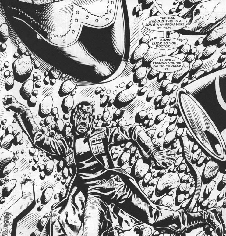 The mysterious Preacher, who if you haven’t guessed yet is a new version of The Master, reappears in the big 10-issue epic “The Glorious Dead”. Leighton Woodrow and his MI6 reappear in the final Eighth Doctor DWM strip “The Flood”.