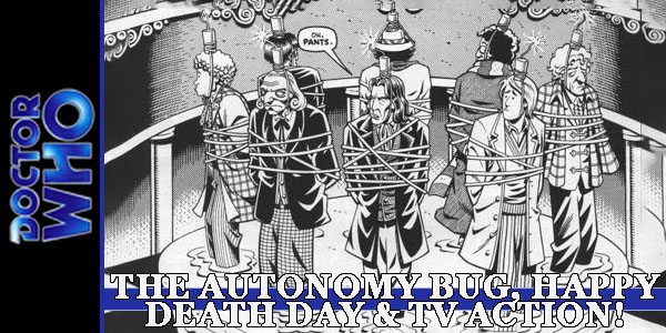 It’s time to end both the Glorious Dead graphic novel and the era of black and white Who comics as we take a look at three light-hearted adventures that originally came out in between and after the titular Glorious Dead, but were all collected at the back of the GN for pacing purposes. Autonomy Bug is three issues long and was the final B+W strip, while the other two are more one-off celebratory efforts… but are any of the three worth a read? Let’s find out!