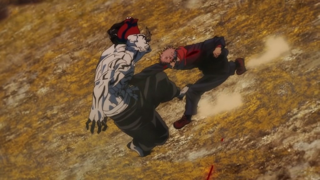 Various people pair off during the contest: Panda defeats Mechamaru complete with backstory for both, Maki and Mai fight each other and we see backstory for them as well, Megumi faces Noritoshi and we get a little hint of what their respective families are like, and Yuji fight Aoi, who immediately bonds with his opponent, calling him “my brother” or “my best friend” (both said in English) and actually helps our main protagonist master his hand-to-hand combat. What was funny is that instead of being confused and repulsed Yuji ends up liking Aoi back and seeing his as a friend and ally, though just not to the same level as Todo does. I have to say that I really disliked Aoi in the previous batch of episodes, but he worked here, so it was just a poor introduction.