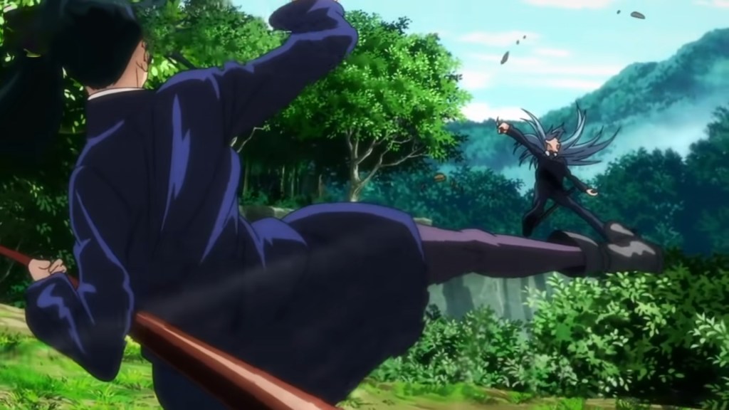 Their teamwork comes in handy when a special grade Curse arrives to break the tournament up in the form of Hanami, who made a brief appearance in the previous batch of episodes and basically looks like a one-armed guy with branches growing out of his eyes. He can control plants and trees and so makes for a tough opponent for our main cast but the combination of Todo and Yuji eventually beat him thanks to the former’s ability to swap places with people and object as the speed of a clap and the latter’s new extremely strong punches. Hanami is beaten enough that he makes his escape after the still super-powerful and “cool” mentor Satoru Gojo breaks the barrier keeping the students in.