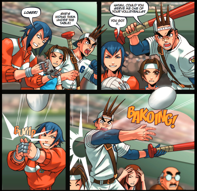 Sakura’s story was rather poor for a stand-alone series. It was focused more on comedy than anything else, and a lot of that comedy didn’t land. She talks to Ryu and he tells her to find as many different teachers and styles as she can because there is always something to learn, and so she goes to a local pro-wrestling show and geeks out over Rainbow Mika as she beats Zangief. At a post-show autograph session Sakura and Mika team up to take down the Red Cyclone as he attacks in a rage, and… well, that’s that. She then gets challenged by her old rival Karin, but Sakura turns it around and makes the challenge a hotdog eating contest, for… some reason. Lots of cheating antics and over-eating gags later and the contest ends without either winning, but Karin tries to attack Sakura anyway now she’s so full she can barely defend herself. With a little help from her allies in the audience Sakura comes out on top and … that’s that. Throw in some “Dan thinks he’s Sakura’s master / thinks she got lucky when she beat him last time” gags and that’s your lot. It’s all fluff and filler, if I didn’t get this as part of a large bundle for a good price I’d be annoyed at paying TPB money for such a non-event of a story.