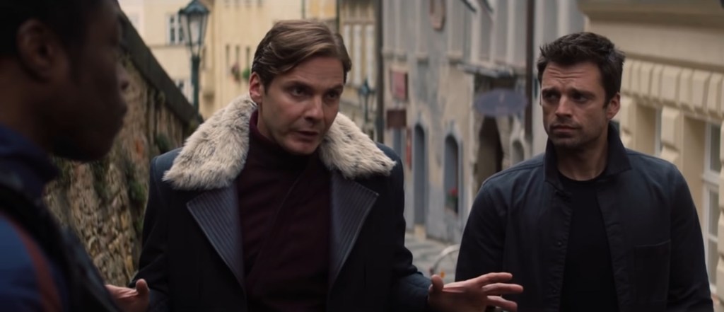 Sam discovers a horrible US secret in Isiah Bradley (Elijah Richardson) who was injected with prototype super soldier serum during the Korean War and then this “black Captain America” was thrown in prison and experimented on for 30 years, all his accomplishments expunged from the public records and his daughter told he was dead (which she didn’t believe but died before seeing him) So… not very nice. Isiah rams the message home to Sam that America will never accept a black man as Captain America over a couple of meetings. On the lighter side Bucky breaks Baron Zemo (Daniel Brühl) out of prison due to his knowledge and contacts, not to mention his desire to rid the world of superheroes would mean he’d also want to stop the super soldier-led Flag Smashers, and soon Sam, Bucky and Zemo head to Madripoor (X-Men reference! *GASP!*) to find the “Power Broker” and the scientist who recreated the Super Soldier Serum. They find the latter, plus Sharon Carter (Emily VanCamp), who is now an enemy of the state and on the run, and Zemo kills the scientist to make sure he doesn’t replicate it any more (and then takes out some goons in his comic-accurate purple balaclava, before never wearing it again…) This is the highlight of the show as the trio make a great comic threesome, the Wakanda Dora Milaje arrive to arrest Zemo and during a fight with the Flag Smashers Battlestar is killed and that sends a now super solider serum’d Walker on a rage-fuelled attack where he crushes someone to death with repeated blows from the shield, a moment that’s recorded by on-lookers.