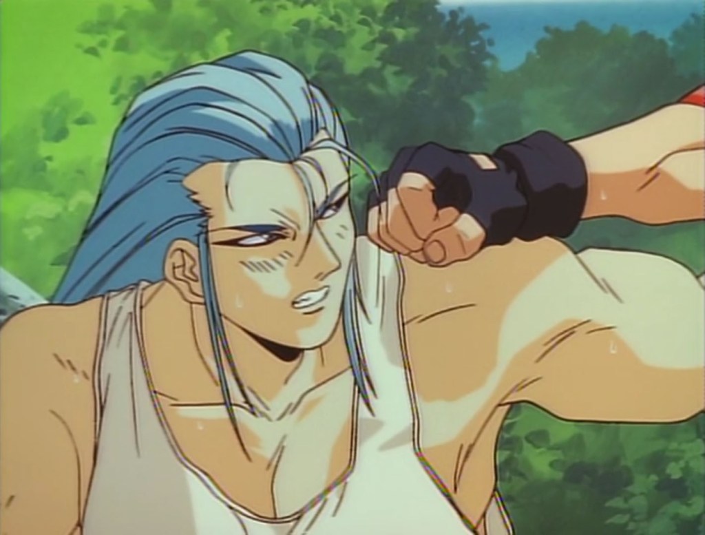 At just 45 minutes, the same length as the classic DBZ movies, it doesn’t have a lot of time to tell the admittedly simple story, so why they added some extra flavour and then cut back on the action I have no idea! So Terry and Andy see their father die and then go off and train in different parts of the world before reuniting in front of their father’s grave and meeting back up with their / their father’s teacher Tung Fu Rue, who says he will pick one of them to inherit his fighting style and learn the final move, one that wasn’t even written in the scroll his other student and Jeff Bogard’s killer Geese Howard took. Terry and Andy decide to fight each other in the up-coming King of Fighters tournament to see who should inherit the title. At the tournament they meet Joe Hisagi, well, Andy had met him previously and Terry had just met him in a brief bar-room brawl earlier in the story, but from here on in they’re a trio.