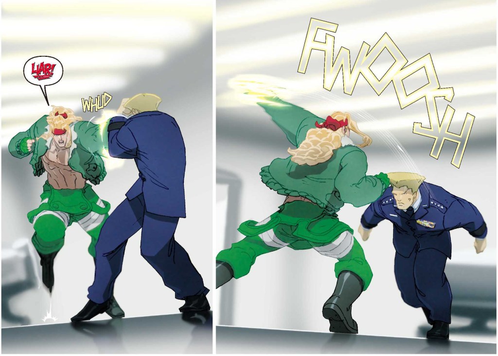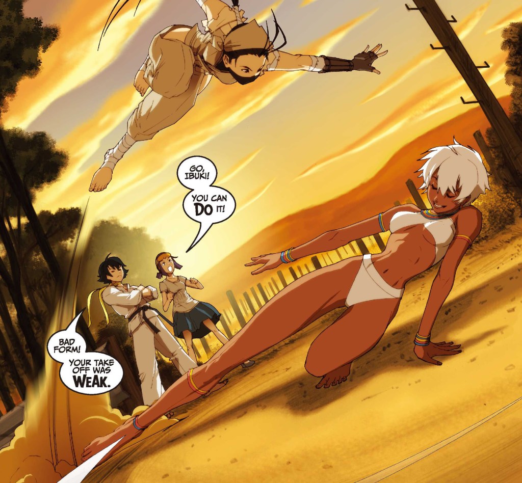So Guile had brought a retired agent named Tom back into the fold to go undercover and spy on “The Society” and he went missing, his only clue is that the Society were targeting Ryu so Guile heads to Japan to search for him. There he finds Sakura possessed by the Dark Hado before she runs away, so he asks E. Honda and Dan what was going on and the latter tells him: Ryu was training Sakura when an apparently resurrected M. Bison and Urien arrived and kidnap Ryu (who is having his own Dark Hado issues), an incident that caused Sakura to blame herself for not protecting her master and embrace the same Dark Hado.