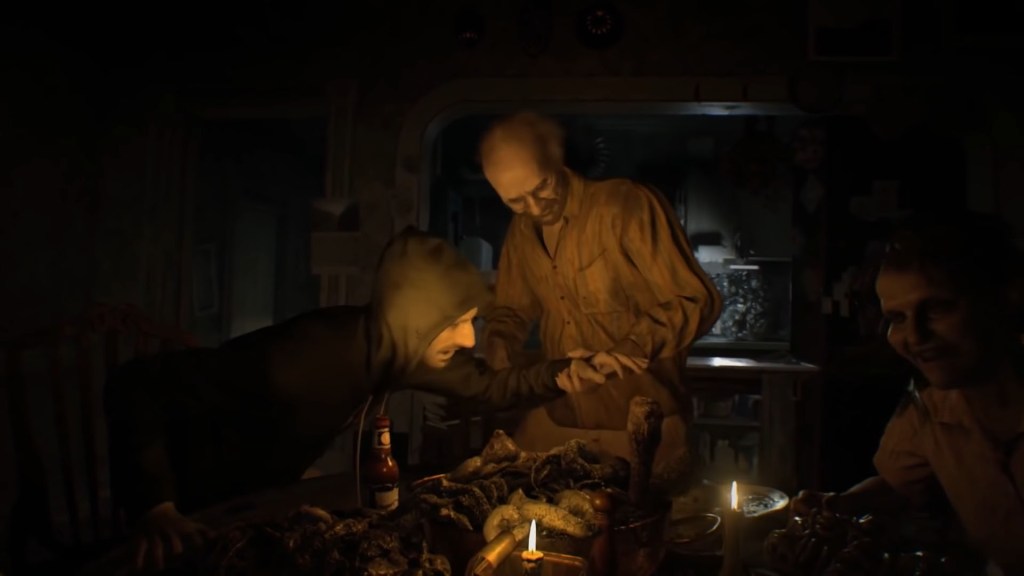 Ethan Winters suddenly hears from his wife Mia, who had gone missing several years earlier. The message leads him to a derelict house in the middle of nowhere, eventually meeting the house’s residents: the Baker family, all of whom are clearly mutated in some way and on the insane side of the spectrum. Ethan also reunites with Mia, who has also become insane and somewhat feral, leading to Ethan trying desperately to escape either with or without Mia. Canonically he gets a single dose of a cure and gives it to Mia, the two leaving the Bakers behind and before finding out the truth behind the whole matter: A group only known as “The Connections” created an intelligent B.O.W. known as Eveline who had the ability to mentally manipulate people via mould-like spores, which is exactly what she did to the Baker family and Mia, just wanting to finally have a family of her own…