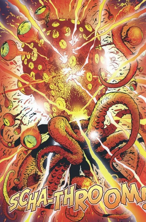 Sadly what’s down there is a large, multi-eyed squid-thing called Kata-Phobus, the last of the native species of Kyrol, who has powerful psychic powers and is irredeemably evil, which is a bit of a let down after the interesting plotting that had gone on beforehand. He turns Alpha on The Doctor, but the latter manages to bring him round while the giant monstrosity arrives in the middle of the Dalek city and begins feeding on the mental energy of all the Daleks. Alpha, realising they’d been fooled by this creature the whole time, instructs his whole race to self-destruct, giving Kata-Phobus a deadly dose of “mental feedback” and destroying it. The Doctor soon becomes appalled when some of the humans still refuse to acknowledge that the Daleks helped them and heads back to the TARDIS with Izzy, but the story ends with the latter being kidnapped by more DWM classic floating energy beings who mistake her for Destrii, the original owner of the body…