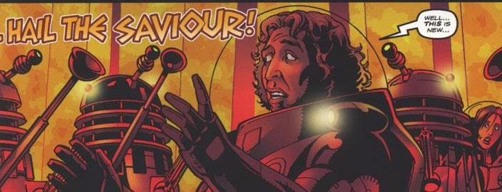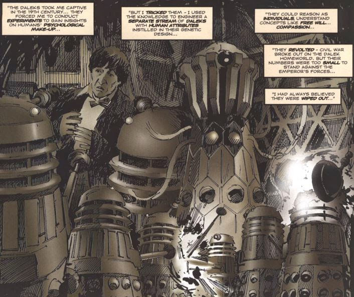 The only other connection is the 10th Doctor TV two parter “Army of Ghosts / Doomsday”, where The Doctor meets “The Cult of Skaro”, which feature Daleks who have learned to become more human in order to outsmart their enemies, including giving themselves names. So, yes, another case of the Russell T. Davies scripts feeling very similar to the Eighth Doctor DWM strips!