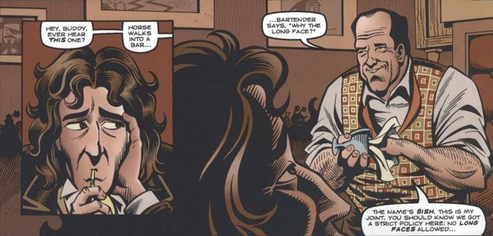 We’ll start with the first story (logic!), that being “Where Nobody Knows Your Name”. As the title suggests it exists mainly as a parody of Cheers, completely with cartoony sci-fi versions of some of the original sitcom cast. The Doctor is at the bar because he’s feeling a bit down after suddenly being alone again, but a few amusing confrontations and stopping a love-scorned robot from self-destructing makes The Doctor feel like himself again. He thanks the friendly bartender for the chat and leaves. That friendly bartender turns out to be Sixth and Seventh Doctor companion Frobisher, using his transforming powers to look like a human rather than his regular Penguin form. Due to The Doctor’s regeneration and his disguise neither knew who the other was, so it was a nice little twist and a pleasant nod to DWM comics from the past.