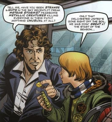 It’s eventually revealed that the Morgs are actually all one entity and they grow new parts (called a “Nukaryote”) to add and rejuvenate their main, erm, mass of stuff, and one such seed had been planted on Earth. The Shakespeare Brothers finish rejuvenating it and it rises into space along with the whole football stadium containing The Doctor, Billy and Ray in order to join the overall whole. Sadly the amusing story ends rather poorly with The Doctor finding a fleshy orb (oo-er!) that apparently controls the entire mass and gets Ray and then Billy to punt some football-shaped non-fleshy orbs at it, causing not just it but the entire Morg Entity to just… explode. The Doctor, Billy and Ray escape in the TARDIS and soon with no Morgs working them to death Delchester United are back in winning form. It’s a fun little strip, which is why I can’t be too down on the complete non-ending…