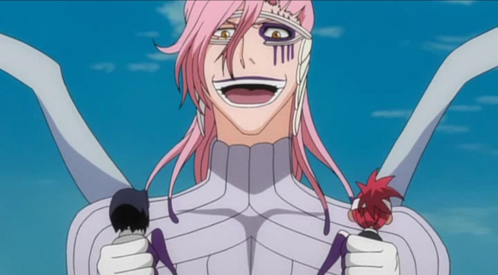 Also Uryu argues and generally comically prats around with Mayuri a lot, which given the last time they met Uryu tried to kill him to avenge his beloved grandfather that the scientist had tortured to death it doesn’t really make sense, even if Mayuri is the only one who could save him. Also we see a tantalising cliffhanger of Mayuri finding Grantz’ storage lab and finding something “very interesting” hanging in the room, but we don’t find out what that is until the final arc, and when we finally do it’s really not that exciting.