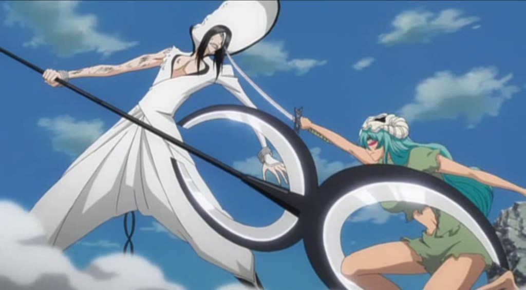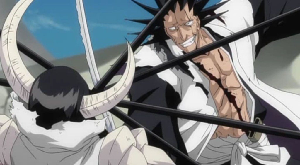 Skipping over the Szayelaporro fight for the sake of putting it in the bad (though I did like the ending…) we then get Kenpachi facing off with Nnoitra, and boy it’s… something. Basically they just start slicing each other up, Kenpachi can’t cut his opponent’s hard skin, then he can, Nnoitra is backed into the corner and uses his Resurrección to both heal himself and gain an extra couple of sets of arms to do more damage and very nearly kill his opponent, before the Squad 11 Captain then says how he never knew striking with two hands gave you more power than randomly flailing about with one arm until he was shown by Captain Yamamoto and slices his opponent damn-near in two with a two-handed “kendo strike”. We see a flashback to Nnoitra’s past where he says his goal is to be in a fight to the death so great that he dies before he even hits the ground, and then we see him slowly falling to the ground with his eyes rolling into the back of the head, showing that he got his wish in the end. While the blood and gore was toned way down compared to the Manga it didn’t take too much away from the fight, at least.