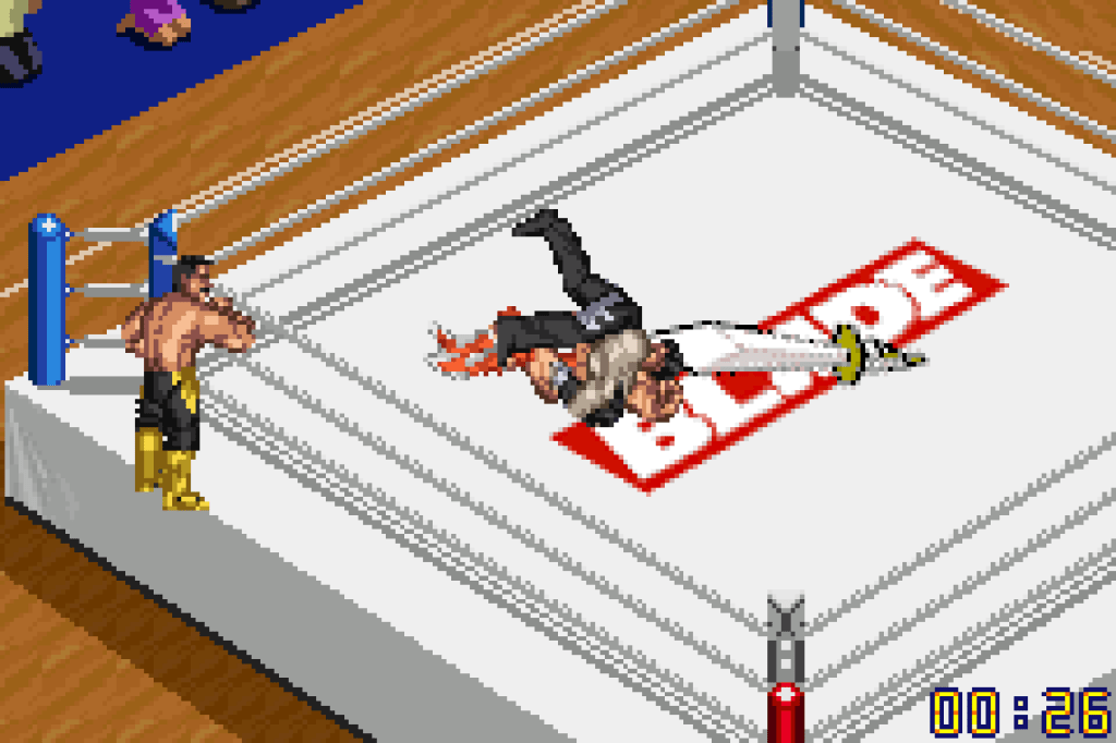 The gameplay in Fire Pro are easy to describe but can take a little while to get down. Strikes are simple enough, in the case of this GBA game you have a single dedicated strike button with standing and running strikes, with running being the other face button, that’s not so bad. Where Fire Pro really comes into its own in grappling. A grapple is initiated when two wrestlers walk into each other, causing them to “tie up”, and you have to time the button press (or a direction and a button press, or pressing both buttons for your most powerful move) to pull the move off. Once you get the timing it’s great, but not a guarantee. For example, there is also a stamina system: do too many big moves in a row and you’ll find yourself gassed, standing in place trying to catch your breath and giving your opponent a chance to do a move. You can regain stamina by holding the R trigger to “breathe”. To kick out of a pin you button mash (though if you’ve taken a lot of damage no amount of button pushing will help) and if you’re caught in a submission move they you roll the D-Pad around to escape, but again you can just give up if the area the submission move is done to is weakened.