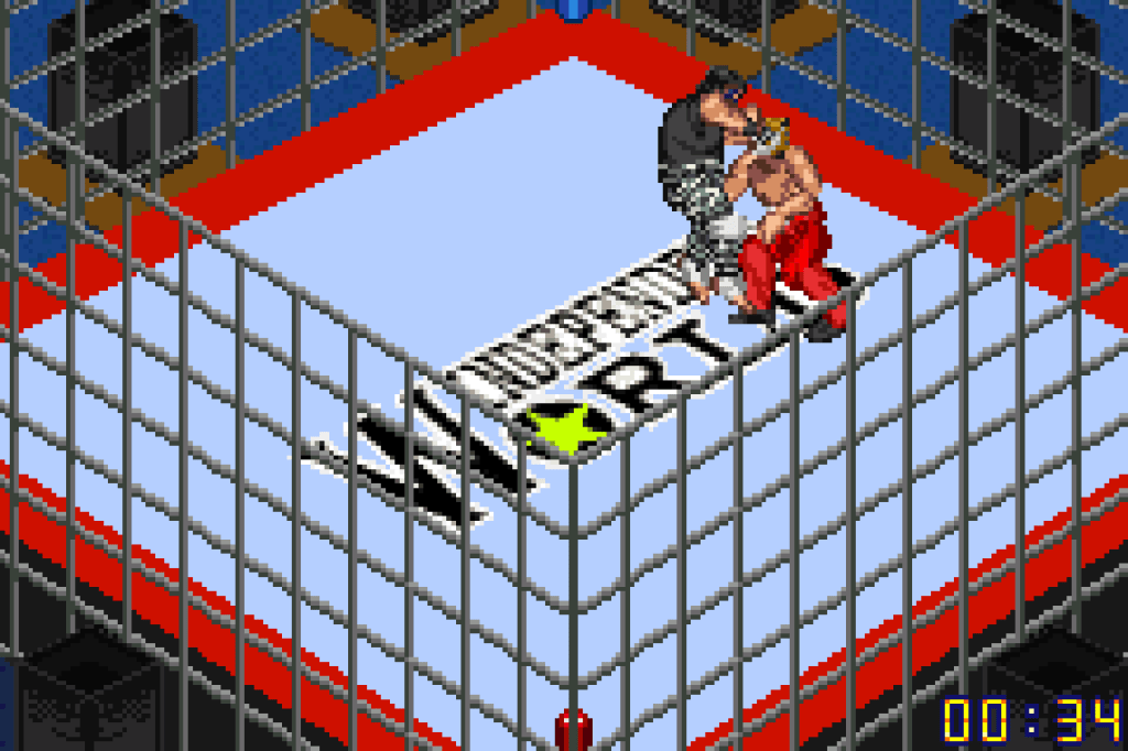 The other classic Fire Pro thing is getting a “Critical”. Randomly when you hit your finisher or submission a notice has a change to come up with the aforementioned word and your opponent is OUT. Either the ref will call the match off or you’re free to pin or make them submit. It’s very satisfying. There are a variety of different match types and rules, from singles, triple threat, four-way, battle royal and tag matches, though given the GBA’s power there is a maximum of four people on screen. You can also fight under different rules, ranging from traditional rules, “American rules” (basically your judged on showmanship as much as skill) and various MMA rules based on promotions like UWF (worked shoot), PRIDE (shoot in a ring) and UFC (shoot in a caged octagon). There are also Cage matches and Death matches, the latter of which includes the full FMW exploding ring stuff.
