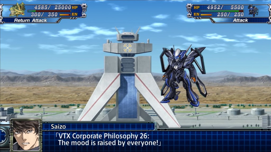 So you play as Saizo Tokitou (or again, Sagiri Sakurai, if you want) who is a proud Salaryman for the VTX Corporation and works for “Special Section 3” as a test pilot for their new “Tyranado” mobile suit. He is joined by co-pilot Rami Amasaki and a trio of other SS3 members who follow in a craft alongside the suit for the duration of the game. The company is ran by Dyma Goldwin, a former ace pilot, while the Earth President is Ame Presbund, also a former pilot and friend of Dyma. The main original threat is a multiple-galaxy-wide empire known as the UND who wish to make a deal with Earth that would allow them to take 1 billion humans to use as an extra army in some far-flung warfront.