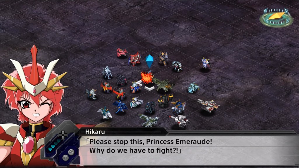 Round three of explaining the many systems of Super Robot Wars. So essentially the game is a cross between a Tactical RPG and a visual novel, but staring mechs and robots from a whole bunch of different anime. So before, during and after playing a map you get plenty of dialogue and story exposition told to you via character artwork and text boxes, which can sometimes be a bit overwhelming, but it is broken up by the actual gameplay. You deploy a certain amount of mechs and characters onto a map made of a square grid, and you can move your characters a certain amount of spaces, do a certain amount of damage to enemies and resist a certain amount of damage from enemies in a turn based format to varying levels based on character and mech stats and equipment.