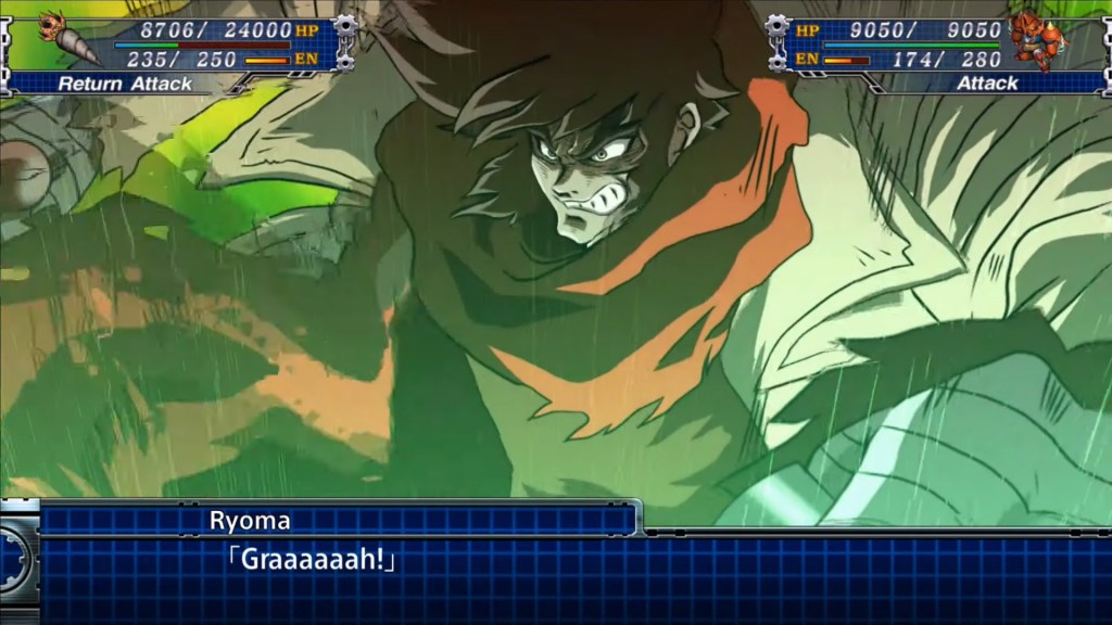This story is combined with Van and his quest for revenge against “The Claw” for the death of his wife (Gun X Sword), the Mazinger pilots fight against the returning Dr. Hell and the new Mazinger Infinity (which at least makes a change from the last two games adapting the Mazinger Zero storyline…), a couple of Neo-Zeon factions are former and the key pilots of the original UC Gundam shows unite to take them on, a trio of Earth girls are selected to pilot God Runes in a magical dimension (Magical Knight Rayearth), the Devil Gundam (or Dark Gundam, if you will) and its deadly DG Cells return alongside a believed-dead Master Asia to cause Doman Kasshu and his Shuffle Alliance some issues, and other stories, like the crew of the Bebop going from one bounty to the next but then getting caught up in the over-all story, Captain Harlock’s Arcadia searching for the fabled land of the same name, the Getter Robo team reuniting or the Gunbuster anti-alien force being deployed for the first time also occur alongside other characters just appearing and getting only brief times in the spotlight (mostly series that are making their third appearance in a row, like Might Gaine and Crossbone Gundam)