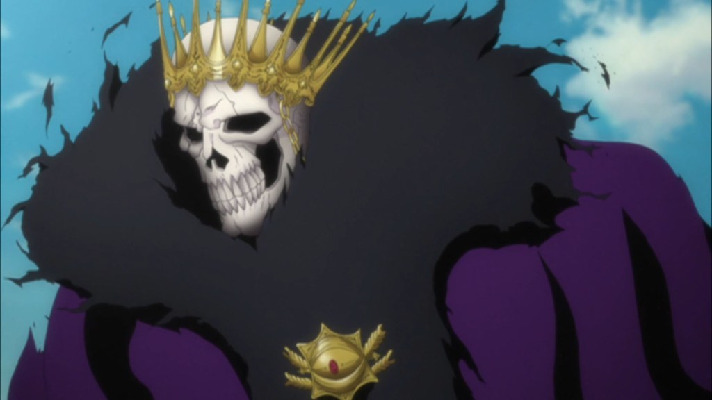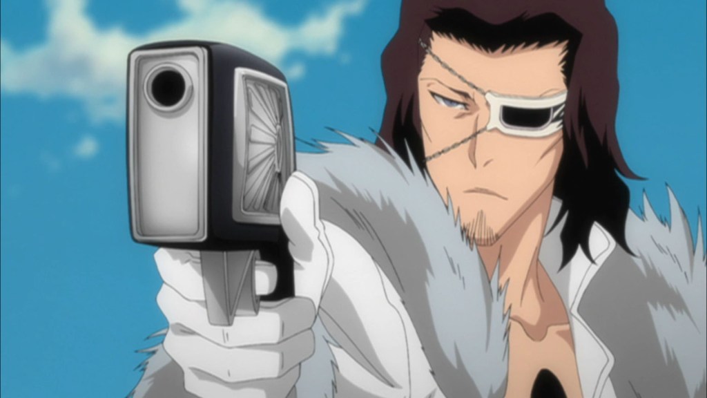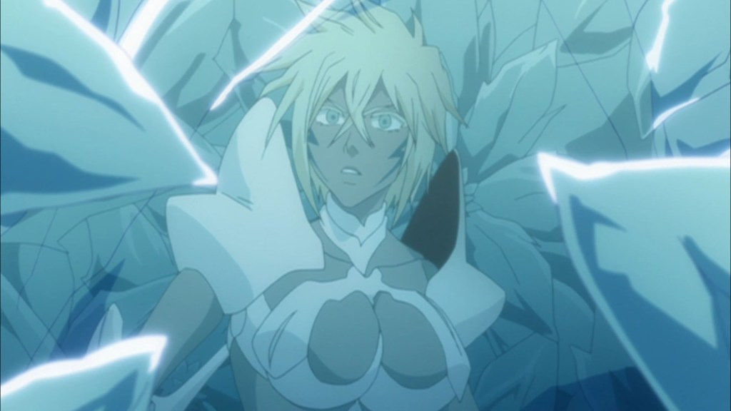 Back in the fake Karakura Town we get a trio of fights that last roughly an episode and a half each, though with a few cutting back and forth. Harribel faces off with Hitsugaya and reveals her Resurrección is water-based, leading to a “I can freeze your water” “well I can turn your ice into water” battle that eventually ends with the Soul Society Captain victorious. Soifon and (sadly) Omaeda then face off with Barrigan who shows his has the ability to control time and age what he touches, then basically goes “screw it” and uses his Resurrección which makes him go full on Grim Reaper with his skeletal appearance and his new “Resperia” attack, a black mist that instantly dissolves anything that comes in contact with it (or in reality ages it to dust). Soifon loses an arm due to the attack but eventually rebounds by revealing her Bankai which takes the form of a gigantic missile. It’s an attack she hates, being the head of the stealth force and all, but it’s enough to seemingly destroy Barragan…