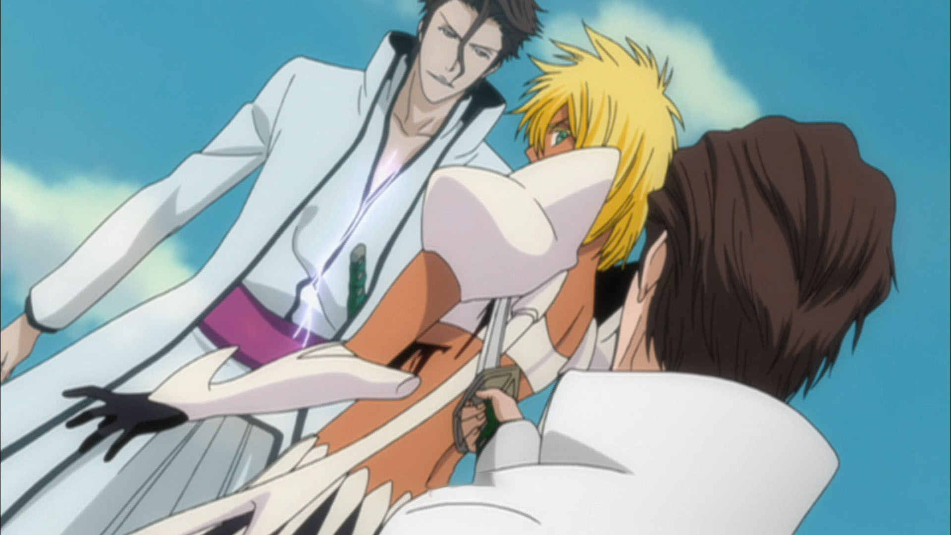 Unexpectedly we cut straight to the battle against Espada #2, Barragan, instead of following the order from the previous showdown. Hachigan had a look at his opponent’s ability to emit a black smoke that literally ages everything to dust in a matter of seconds and decided that his stupidly high level of kido would trap him, but no matter how high a level the barrier it still dissolved with enough accelerated aging. Hachigan then goes crazy with the barriers and makes a deal with Soifon, who completely unfairly holds a grudge against him and his follow Visoreds for being partially responsible for Yoruichi leaving her (but, you know… talk about wasn’t their fault!) This gives Soifon an opportunity to use her Bankai again but this time in what equates to a small box, therefore not allowing Barragan the chance to avoid the blast. Now with only half a skull the Espada emits a bunch more of his deadly black smog and catches Hachigan’s arm, but the large Visored teleports his vanishing limb into the body of his foe, under the correct assumption that while Barragan’s outside is immune to his aging smoke his inside isn’t. We see a fun flashback of Barragan as King of Hueco Mundo and how he ended up having to be subservient to Aizen, then as he slowly turns to dust he throws his axe towards that same man for having the gall to consider himself better. The axe vanishes before it even reaches Aizen as the former King himself turns to dust…
