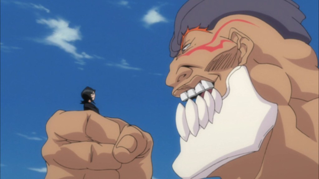 We start off right where we left off (minus an obscene amount of recap I’ll get to later) as the Visoreds and specifically Shinji make their intentions clear to Captain General Yamamoto (that they aren’t on Soul Society’s side, but against Aizen and his army and allied with Ichigo… so basically on their side) and then the super-massive Hollow known as Fura spews out a large group of Menos Hollows for the sole purpose of allowing our new heroes to show off and defeat them easily. The Visoreds then split up and pick an Espada to fight, with Lisa and Hiyori joining with Hitsugaya to fight Harribel, Love and Rose squaring off with Stark, Kensei and Mashiro take on Wonderweiss and Fura, Hachigan is the only one brave/stupid enough to join Soifon in facing Barragan, and Shinji heads straight for Aizen but gets stopped by Tosen, who then squares off with Kommomura and Shuhei, leaving Shinji to face and Gin.
