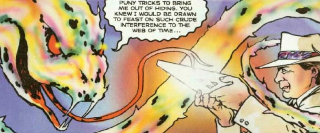 Otherwise the actual story sees The Doctor send Ace and Benny to two weak points in time to intentionally mess things up so the infamous Timewyrm from the first three NA books can try and break free from the “Puterspace” it was trapped in. The “wyrm” manages to pull The Doctor into the realm only to find out this was The Doctor’s plan all along as he traps the Timewyrm in Puterspace forever by removing its ability to travel between dimensions.