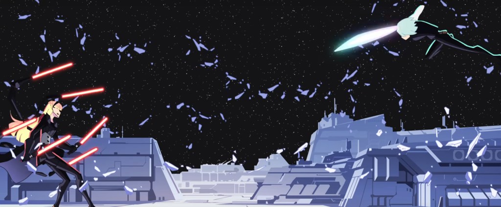 Firstly the ones that stick out the most to me are “The Duel”, “The Twins”, “The Ninth Jedi”, “The Elder” and “Lop and Ocho”. “The Duel” is based on the old black and white Samurai films made by Akira Kurasawa, the same ones that heavily inspired the original Star Wars film. A lone Ronin-like man named… Ronin is in a village that comes under attack by weird Samurai-looking Storm Troopers and eventually Ronin steps in to defend the village, fighting what looks to be either a Sith or an Inquisitor (not that these have to fit into any established timeline!) and revealing he’s not a lone Jedi but a former Sith himself, the two clashing with red lightsabres while everything else is in black and white. It’s great stuff. Ronin wins and wanders off, as Ronin tend to do. “The Twins” is just Studio Trigger doing crazy over-the-top Studio Trigger things, and it was great! Two twins born of the dark side via some Exegol-like clone craziness are given a massive vehicle that’s essentially two star destroyers joined together by a massive canon. The male twin, Am, turns to the light side and tries to steal the kyber crystal at the heart of the vehicle but is stopped by the female twin, Karre. The two fight in increasingly overboard fashion until Am defeats his sister by doing some sort of crazy lightsabre swing while activating hyperspace. Insane, in the best possible way.