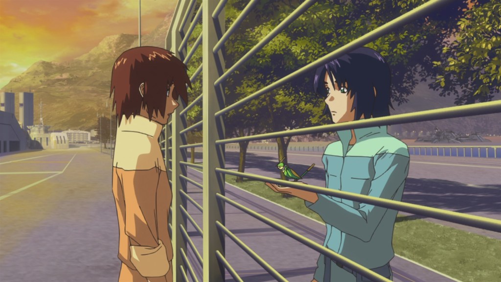 So as mentioned the main set up of this whole bunch of episodes is that the Archangel end up at Orb, the neutral nation that had secretly helped them, and get repairs while their ZAFT pursuers wait outside, not buying the idea that they’ve left the country. Athrun, Dearka, Nicol and Yzak sneak onto the island and eventually run into Kira and his robotic bird Birdie, which flies off to its old creator in Athrun. The two former friends act like two strangers happening to meet but manage to say a few kind words before going their separate ways. As the Archangel leaves Orb things take a dramatic turn for the worse as ZAFT ambush them as soon as they can and Kira ends up killing Nicol in the heat of battle, enraging Athrun, Dearka and Yzak. A short while later and the two sides do battle again, this time Kira’s close school friend Tolle is killed by Athrun and in a mutual fit of anger the two old friends battle to a deadly draw, both their machines being destroyed and Kira seemingly killed. It’s a great moment and shows how the horrors of war can easily turn a friendship sour.
