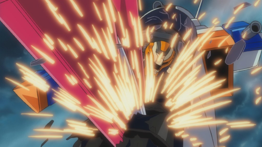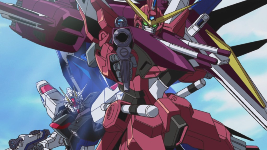 This all leads to another big battle as the Archangel crew and Kira decide to join Orb and fight as a third, separate force dedicated to peace but their plan is put in jeopardy by the arrival of an Earth fleet led to head of racist supremacist group Blue Cosmos Muruta Azrael (a blatant racist having a high position of power?! Unrealistic!) and on board are three new teen pilots each controlling three new Gundams (yes, three-quarters through the series and we’re introduced to five new suits!) but all three have serious mental issues harking back to the Cyber-Newtypes of Zeta Gundam. The peaceful island of Orb is destroyed and Kira looks like he’s going to fall to the new Forbidden, Raider, and Calamity Gundams until he’s saved by Athrun, the two joining forces despite all they went through the last time they met on the battlefield. The Orb battleship and the Archangel head into space, with Kira and Athrun helping each other onto the ships at the last moment…