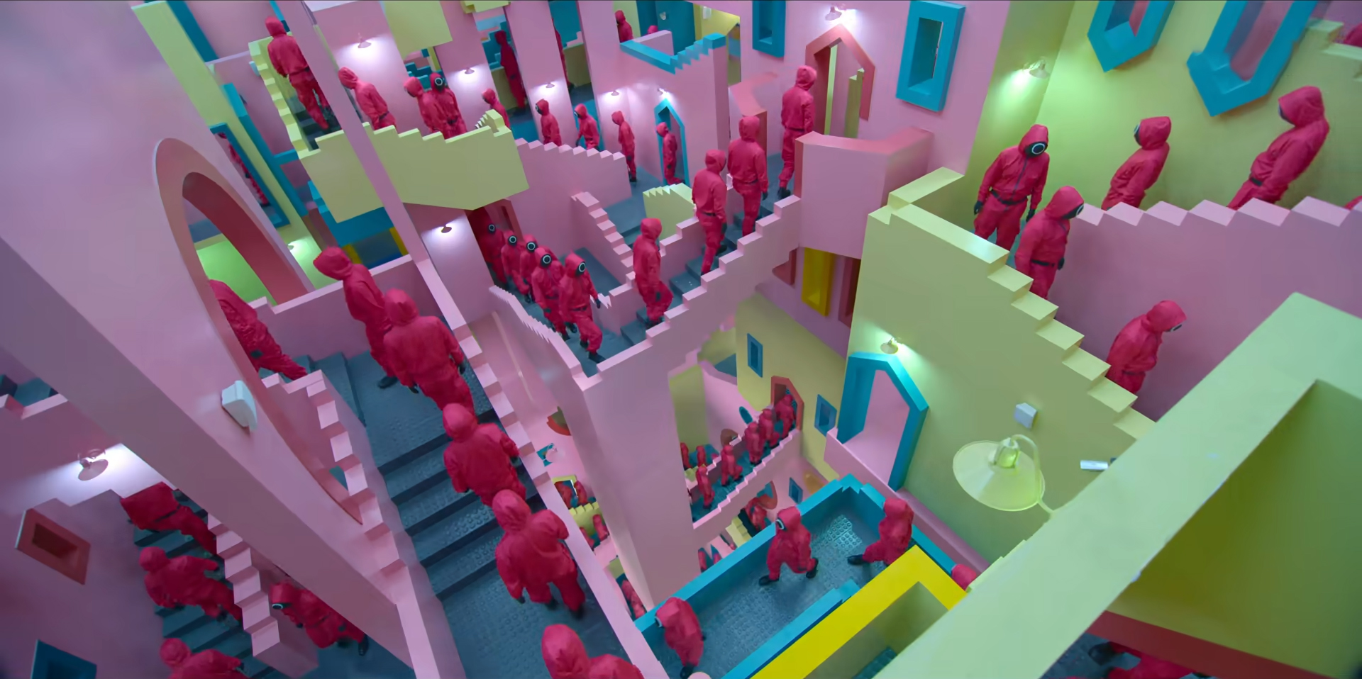I love the look and set design as well. The people behind the games wear pink overalls with black masks, each with either a square, triangle or circle denoting where in the chain of command they sit. At the head of them is the Front Man (Park Si-wan), who wears a sharp-angled black mask and more trendy black attire. As either the workers or the contestants are moved about they often walk through a colourful staircase room that looks like something out of Relativity by M. C. Escher (or “the painting with all the stairs” as I just typed into google to find the name and artist out…) It’s all backed by some weird Disney-like “workers plodding along” type music is the best way I can think to describe it. It’s all very odd and unsettling, in the best possible way.