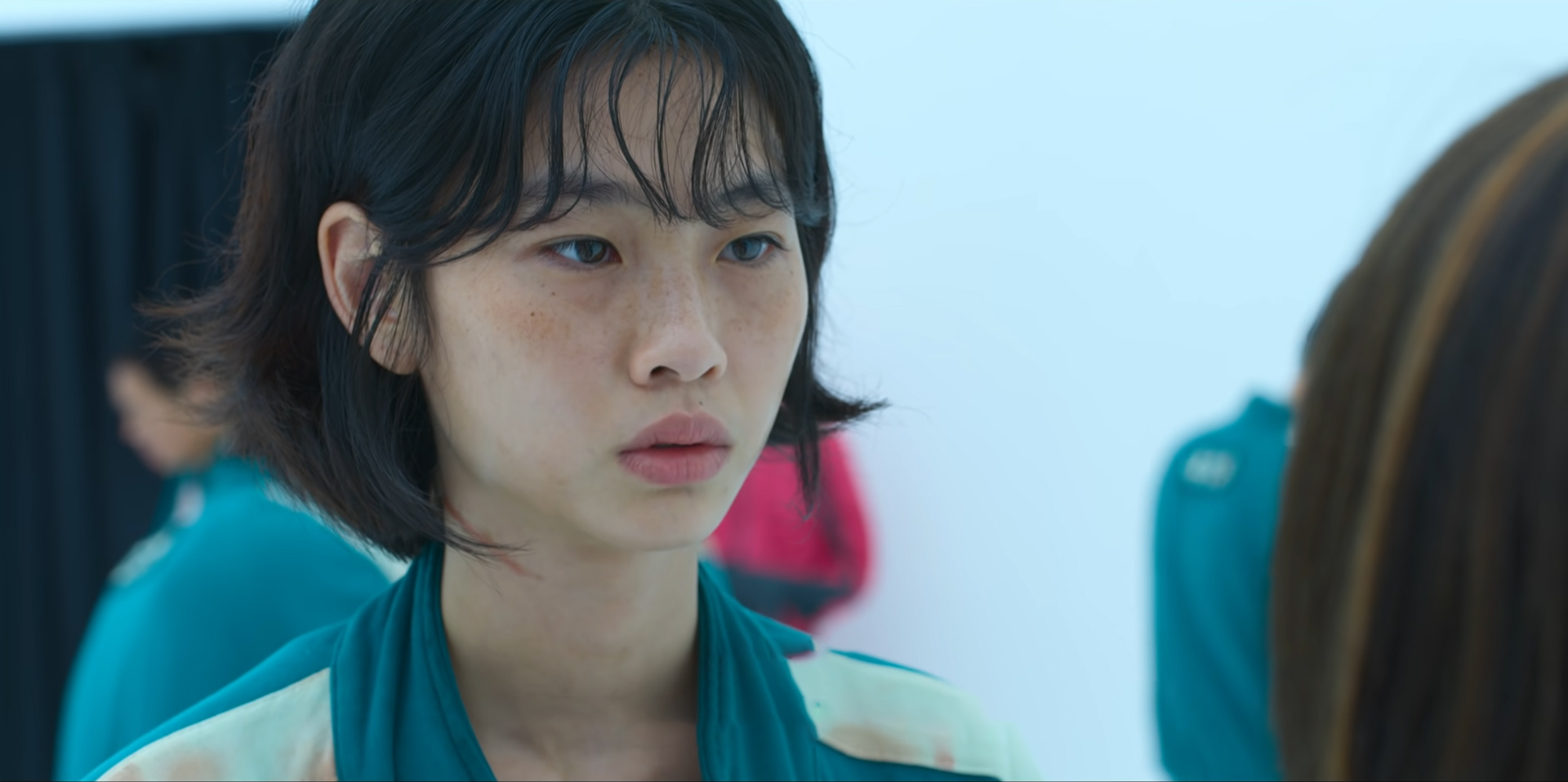 Among the contestants are Seong Gi-hun (Lee Jung-jae), a divorced Dad who’s living with his mother and still acts like a spoiled child, Cho Sang-woo (Park Hae-soo), Gi-hun’s childhood friend who everyone around him was so proud of because he went to a top business school but it turns out he’s millions in debt, Kang Sae-byeok (Jung Ho-yeon) a defector from North Korea who needs the money to track down and smuggle her mother across the border as well as look after her younger brother, Oh Il-nam (O Yeong-su), an old man with a brain tumour who sees playing this game as better than just lying in a hospital bed and dying, Abdul Ali (Anupam Tripathi), a Pakistani worker who is being mistreated by his employer and needs to provide for his family, Jang Deok-su (Heo Sung-tae) a Korean gangster who is now in massive debt after gambling behind his boss’s back, and Han Mi-nyeo (Kim Joo-ryoung) a rather unpleasant woman who is very good at lying to get what she wants. It’s a varied cast of people who are easily manipulated…