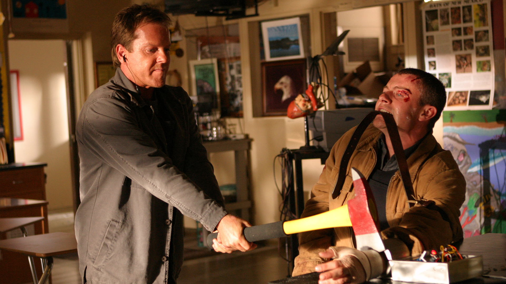 We’re soon introduced to the new big bad of the show: Stephen Saunders (Paul Blackthorne), a former MI6 operative that was believed killed in the same operation to take down Victor Drazen that was the focus of much of Season 1. After being left for dead by the American-led team and tortured for two years or so Saunders grew an intense hatred for the US and their “spreading of their corruptive viewpoints” so secures the deadly virus and even releases it in a hotel to show he means business before contacting the President and telling him on no uncertain terms that he will do what he says or 11 more vials of the virus will be released in major US cities. He’s a good central villain, if not a little on-the-nose evil for his first bunch of episodes though a weakness does humanise him somewhat later on. Classic Division leader and CTU regular Ryan Chapelle begins to investigate him and soon gets a bit too close so Saunders instructs the President to have Ryan killed, which he eventually agrees to but only because Chase and co are on the way to his reported location. Jack and Ryan play along and head to the assigned point only for Chase to come up empty, leaving Jack no other choice than to execute Chapelle with a bullet to the back of the head. It’s one of the most emotional and dramatic moments in the series’ eventual long history, and full credit to Paul Schulze for his performance here.