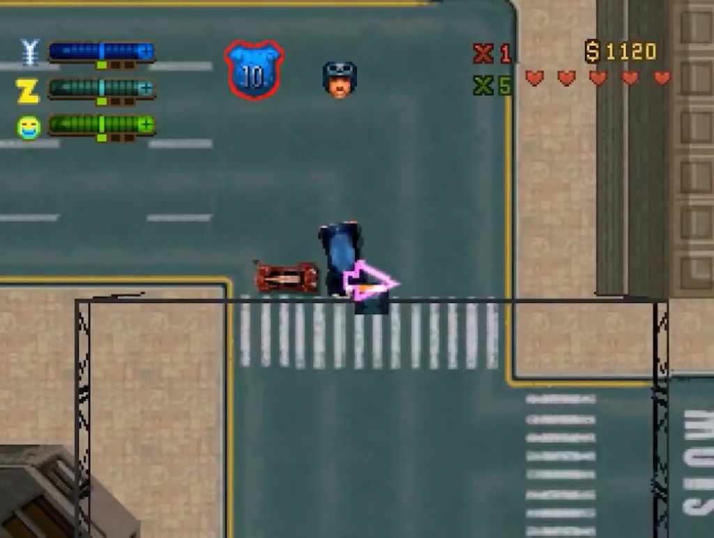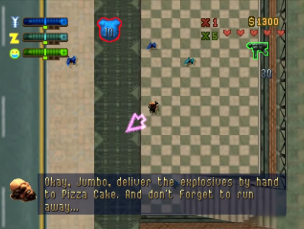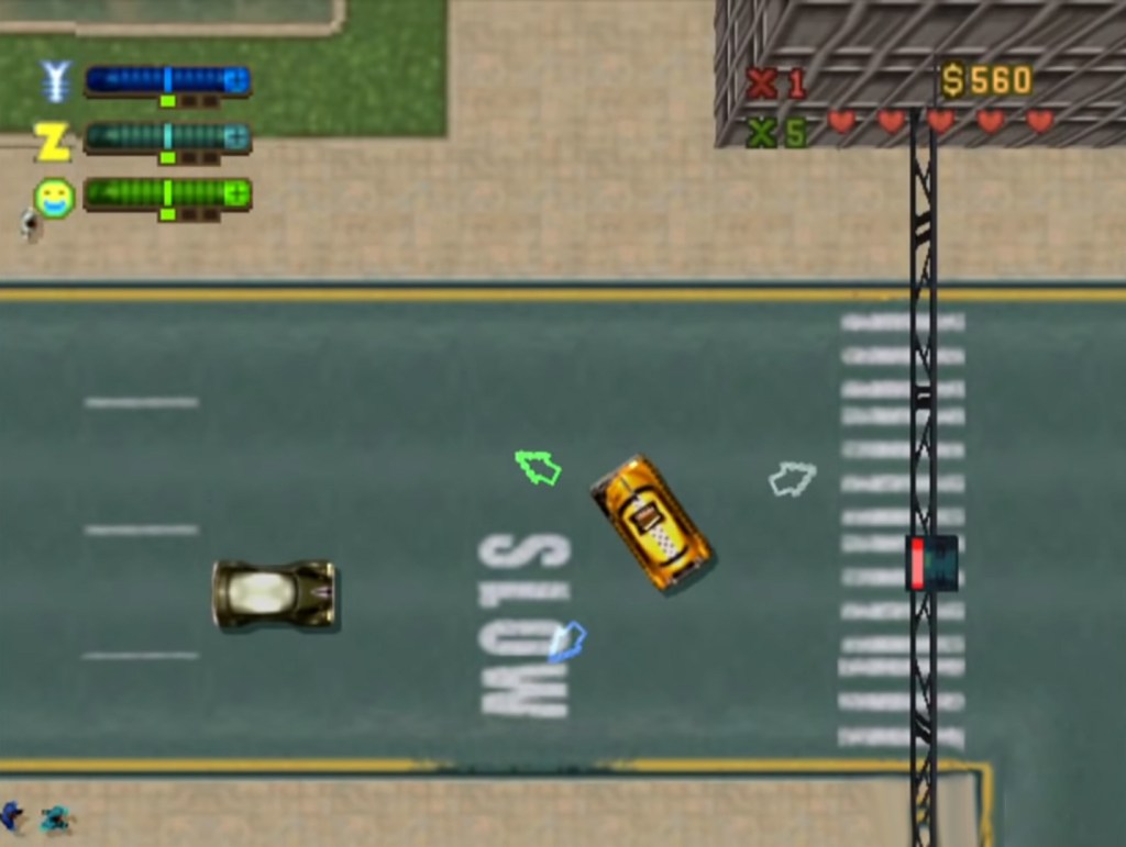 What GTA2 does differently, and differently to all games that come after it as well, is the Respect system. You see each of the three maps have three gangs operating in it, one is the Zaibatsu Corporation (legit business that also takes part in illegal activity… like, all of them), and then in the first area, the Downtown District, you have the Loonies (bunch of crazy people working together vaguely) and the Yakuza (self-explanatory), in the Residential District are the SRS Scientists (underground scientists performing off-the-record experiments) and the Rednecks (… just some rednecks with pickup trucks and guns…), and finally in the Industrial District is Russian Mafia (self-explanatory) and the Hare Krishnas (peaceful religious people… who kill). As you do more and more missions for one faction you unlock more missions with higher pay-outs but you also start gaining a negative rep for the other gangs in the area, let it get too low and they’ll shoot you on sight should you wander near their territory. It was great fun “picking a side” and then having to motor through the SRS area avoid flamethrower-wielding clone people (don’t ask) or other such issues. It’s all helpfully indicated on the top left of the HUD and definitely the thing I always remember about the game.