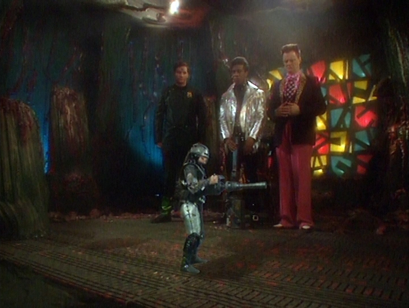 Episode 6 then, titled “Meltdown”, sees the crew find a device that can teleport them around the ship and to nearby habitable planets. They use it and end up on a planet that used to be a theme park called “Wax World” long ago, featuring wax androids of famous historical people and fictional characters that have since gained sentience and ended up in a deadly war, all the evil of history teaming up to take out the nicer wax droids. Rimmer decides to play general and lead the good wax facsimiles into battle alongside Kryten while Lister and The Cat get stuck on the evil side dealing with wax work Hitler and others. It’s as crazy as it sounds and includes a scene of a Mother Theresa running across a field with a machine gun before being exploded, so … yeah. In the end both sides are entirely wiped out, which Rimmer feels is a victory unlike his three crew mates.
