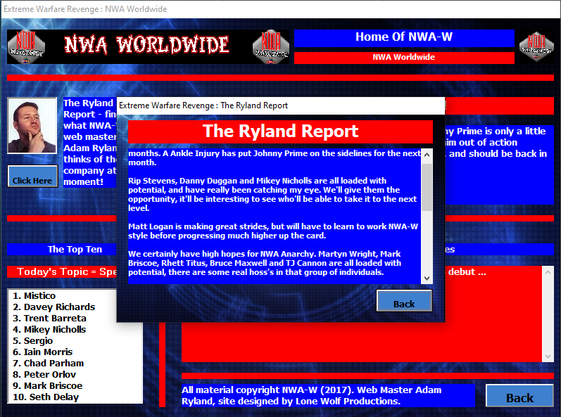 The “Ryland Report” from one of my other longest running games, where I took the NWA back into glory. Funny to see the likes of Mark Briscoe and Rhett Titus described as “Hoss’s” but that’s the JR parody for you!