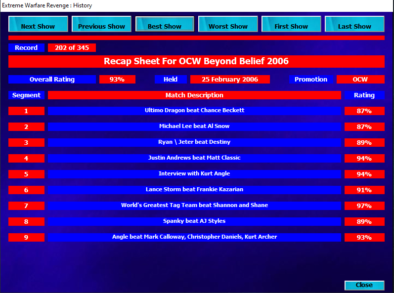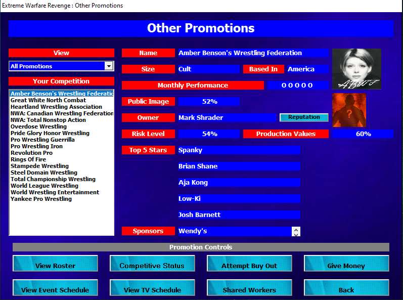 The first version of Extreme Warfare Revenge was released on June 15th 2002, itself a sequel to Adam Ryland’s previous promotion booking sims Extreme Warfare and Extreme Warfare Deluxe. Over the next year and a bit the game saw several massive overhauls, including the ability to assign pictures to promotions and wrestlers with 4.0, which was very exciting at the time (and led to my first exploration into photoshop to give a hand, including making a logo for the randomly generated promotion Canadian SOMETHING SOMETHING, which ended up in the game officially!)