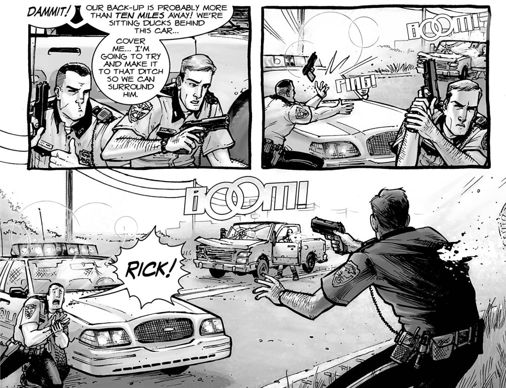 Speaking of the story, it does follow similar beats to the TV show (or rather the other way around, but you know, coming at it from a TV first perspective…) in that Rick is shot and falls into a coma then wakes up in a hospital in the middle of a zombie apocalypse. That was something that took me by surprise actually, I thought the TV series never using the word “zombie” came from the comics, but nope! I guess it was a decision from the TV execs as they’re referred to as zombies frequently here. Anyway after being saved by the first survivor Rick meets in Morgan and his young son Duane Rick searches Atlanta for his family only to be surrounded by the undead but is saved by Glenn, who takes him back to a small encampment outside the city where his wife Lori, son Carl and old partner Shane are all alive and well.
