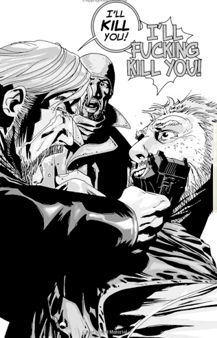 There is also a character called Allen whose wife Donna is killed in Volume 1 and so he spends the second volume in deep depression, only his twin children keeping him from suicide and at one point calling Andrea a c**t for trying to break him out of it. It’s very dramatic and well written (and drawn!) don’t get me wrong, but I don’t know, I just didn’t get on with it. Instead of feeling sympathy for him it got to the point where it was just “oh him again”. Seems harsh, but maybe it was too real a drama for my escapist zombie comic…?