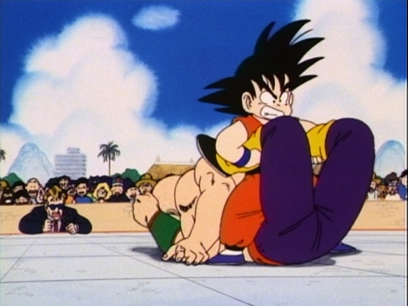Goku applies the Boston Crab to a four-armed Ten. What? Yeah, one of Tenshinhan’s unique techniques was to grow an extra set of arms. Why he never uses that again I can’t tell you…